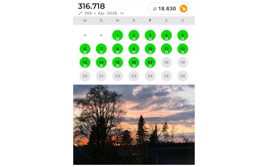 Freitag 17. April💁🏻💕heute die 310000 Schritte schon erreicht und bei der Abendrunde wurde ich mit diesem tollen Farbenspiel des Sonnenuntergangs belohnt.